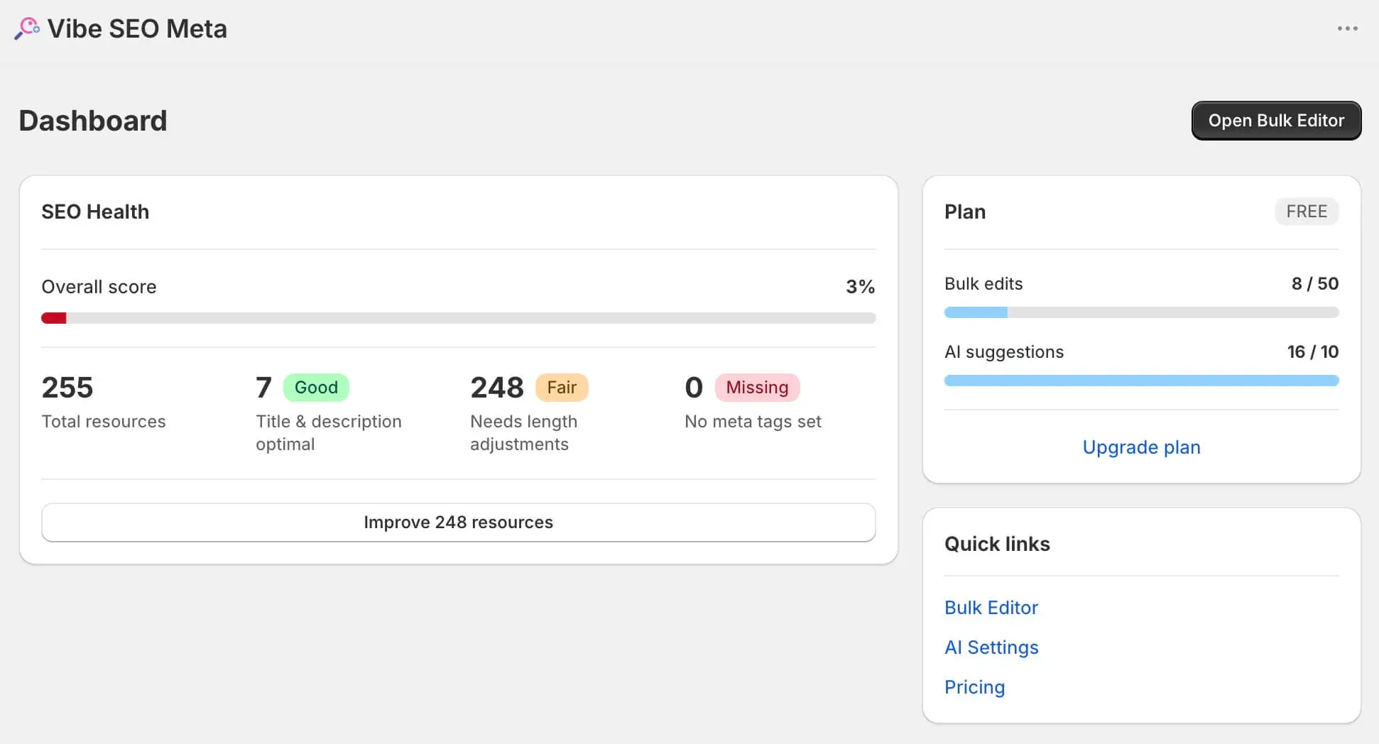 Install Vibe SEO Meta and bulk-optimize your Shopify store today.
